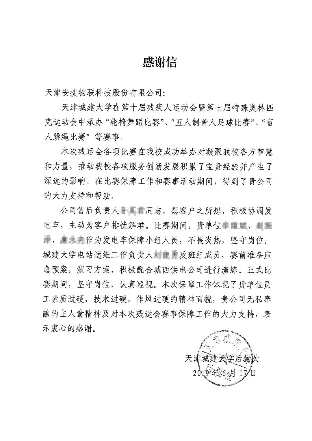 图为残运会保电现场与天津城建大学感谢信