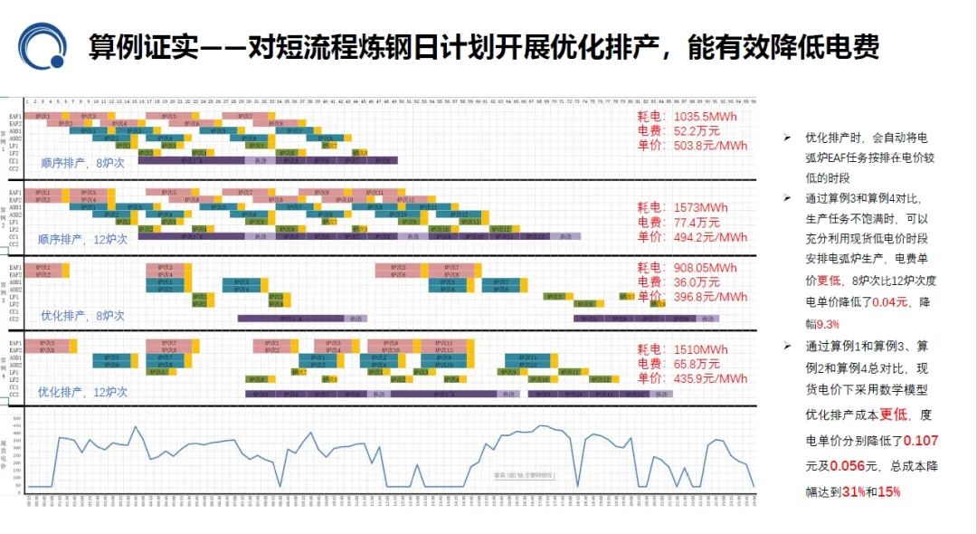 通过模拟测算,利用多宝电竞物联电力交易管控平台,在现货电价下采用数学模型,通过优化排产,成本更低,8次炉和12次炉的度电单价,分别降低了0.107元及0.056元,总成本降幅达到31%和15%。